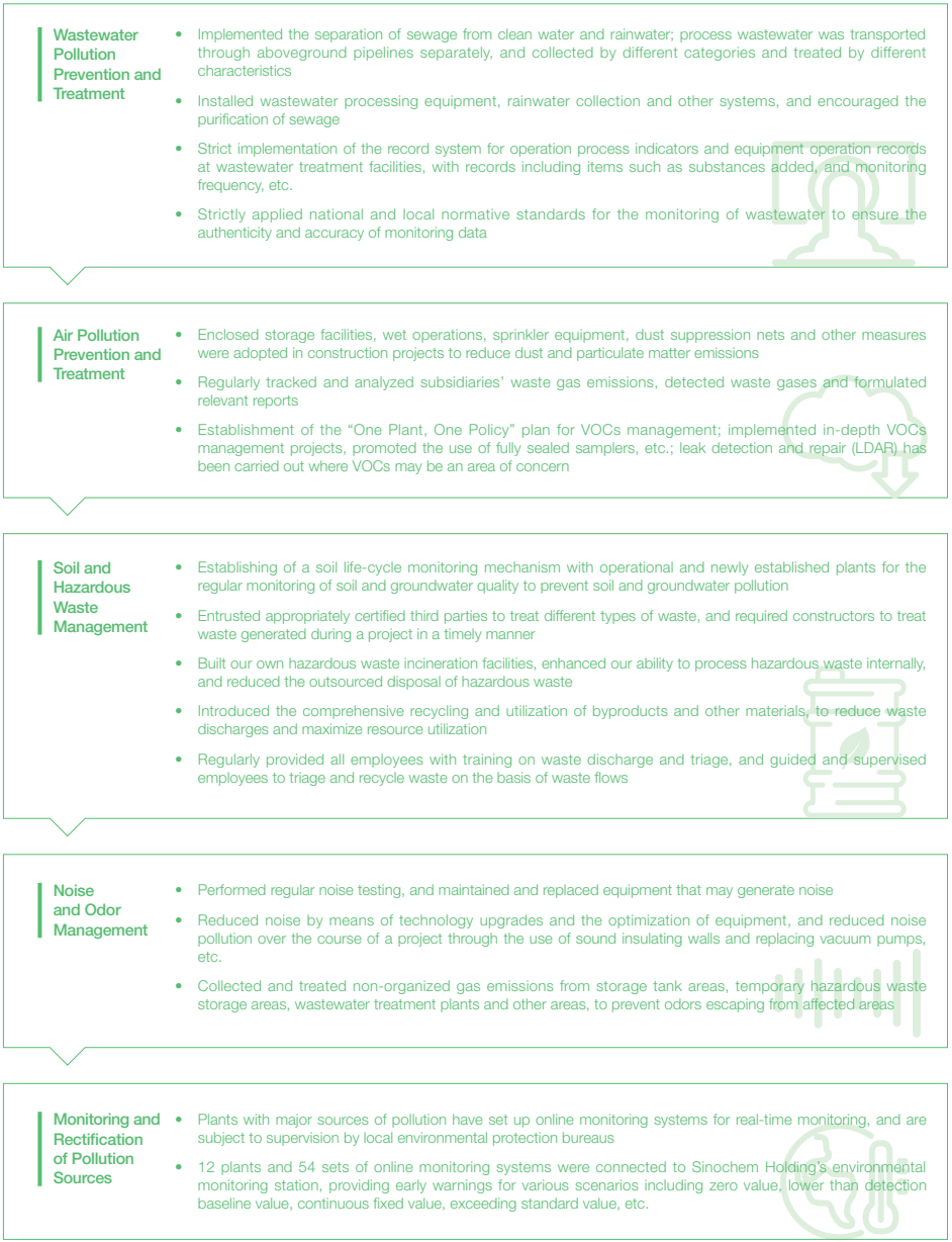 Sinochem International has formulated documents including an Environmental Protection Management Measures, Environmental Protection Responsibility System and Clean Production Management Standard, and has established an environmental management system covering all business units, set up a full-staff, full-process, full-position environmental risk detection, control and management mechanism. We performed environmental impact assessments on new, modified and expanded projects, and performed regular onsite environmental management monitoring and inspections as well as follow-ups of rectifications to hidden hazards. We are also taking “Creating Green Plant” as a key starting point and continuously promoting refined management of environmental protection..