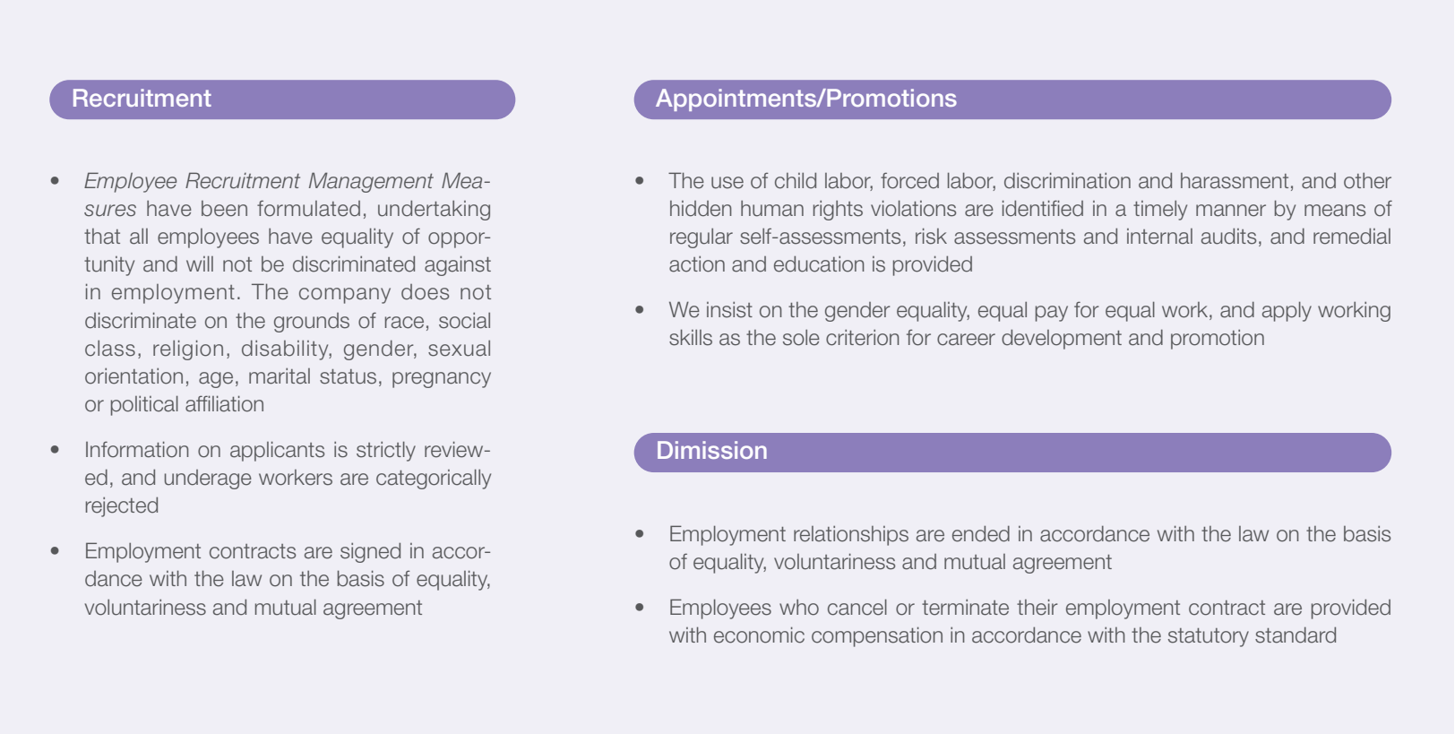The company strictly abides by the laws and regulations of China and the various overseas regions it operates in, having formulated the Labor and Human Rights Policy. Upholding the “fair, equitable and transparent” principle of legally compliant employment, we value and safeguard the rights and interests of employees, respect their values, individuality and privacy, create a diverse, equal, and inclusive working environment, and build harmonious labor relations.