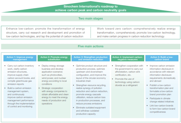 Sinochem International publicly released its "Energy Management and Climate Change Policy," which incorporates the improvement of energy management and response to climate change into the company's operation and management. The firm also compiled a list of greenhouse gases in accordance with relevant national laws and regulations, which is dynamically adjusted and updated according to the actual situation every year. The company is comprehensively sorting out energy-savings and emission reduction projects, carrying out a carbon inventory of production enterprises, engaging third-party agencies to carry out professional inspections and issuing inspection reports for key enterprises, establishing a carbon emission database, and monitoring the greenhouse gas emissions of all production and operation enterprises. Sinochem International is also establishing a regular communication and coordination mechanism for its "dual carbon" work, initiating research on peak carbon and carbon neutrality paths, formulating the "Peak Carbon and Carbon Neutrality Action Plan," and comprehensively deploying low-carbon development plans. Continuing to deepen carbon information disclosures, it accepts regulation by the government or other regulators, and will gradually explore climate change disclosure.