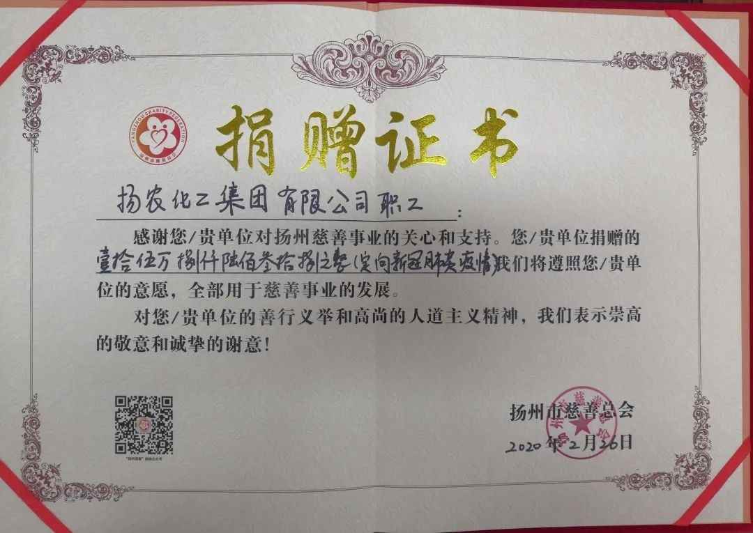 克日,AG旗舰厅下属扬农集团全体职工响应公司党委建议,起劲捐钱助力新冠肺炎防治相关事情。本轮募捐捐钱人数3529人,捐钱金额共计835179.11元,所召募款子已所有捐给扬州市慈善总会以及各子公司所在地的慈善总会、红十字会,用于抗击新冠肺炎疫情。